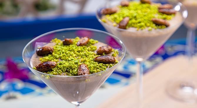 تترك لتبرد مدة 10 دقائق مع وضع طبق على وجه المقلاة، ثم يصب المزيج في 8 أكواب زجاجية أو أوعية زجاجية للتقديم.
