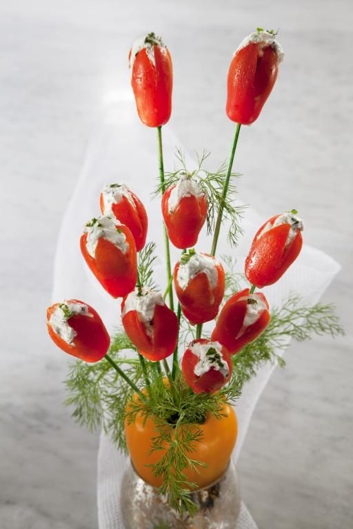 4-للتقديم: ثبتي كل حبة طماطم محشوة في عود خشبي وقدميه على شكل بوكيه في حبة الفلفل الحلو أو في إناء زهور جميل.