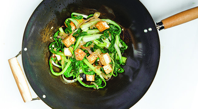 يضاف باقي الزيت ويُشوح فيه الثوم والبصل إلى أن يطريا ويتحمرا قليلاً، ثم يضاف البوك تشوي ومكعب مرق الخضروات ويُحمر مع التقليب إلى أن يبدأ في الذبول.