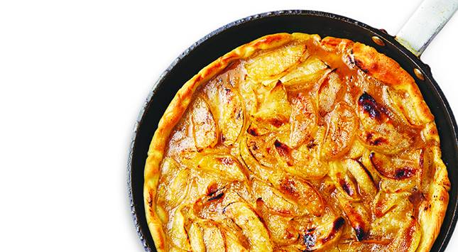 يُغرف التفاح المكرمل على عجين البيتزا المخبوز.