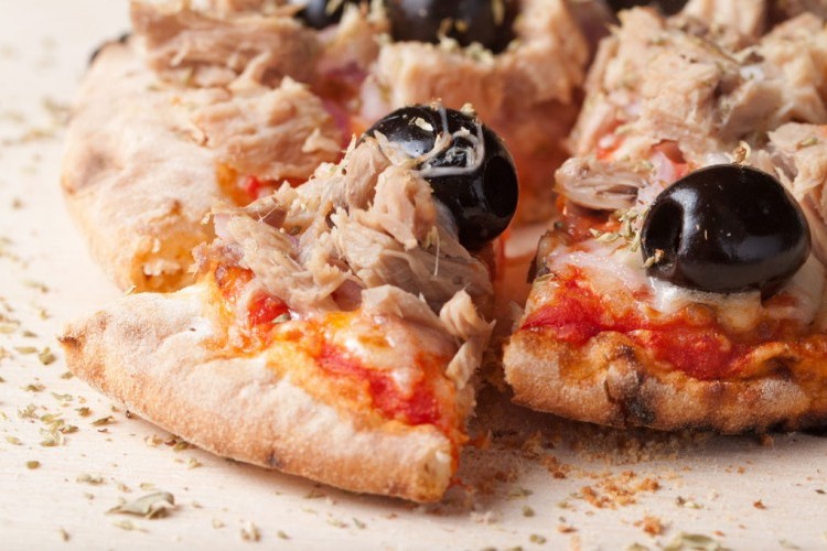 4. اخلطي التونة مع الزيت و الفلفل الأسود ووزعي الخليط فوق صلصة البيتزا على العجين.