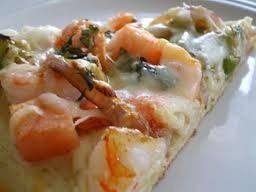 تضاف صلصة البيتزا فوق العجينة ،ثم  يضاف الجمبرى ثم يضاف الفلفل الأحمر والأخضر والطماطم والبصل