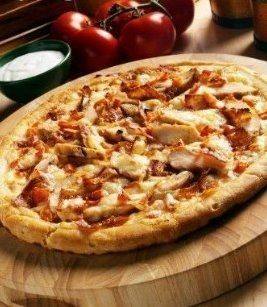 افردي صلصة الطماطم على عجينة البيتزا وانثري عليها شرائح الدجاج .