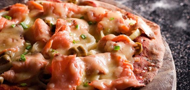 - نضيف شرائح السلمون المدخن ثم نوزع جبن الموزاريلا وشرائح الفلفل وقطع الزيتون الأسود على الوجة.
