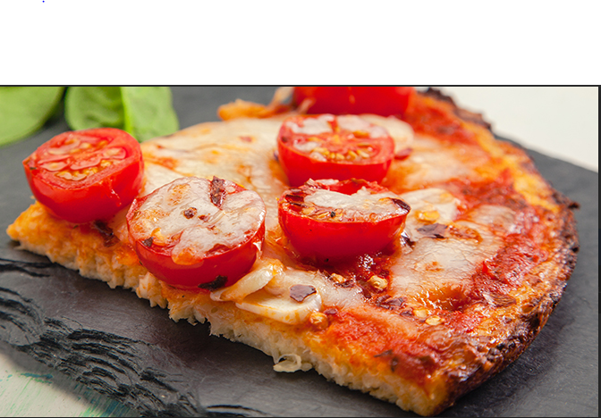 توضع الصلصة على البيتزا و4/3 كوب موتزاريلا والطماطم العنبية والثوم ورقائق الفلفل الأحمر.