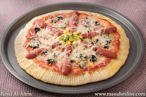 8. اخبزي البيتزا في فرن200مْ الى ان تصبح ذهبية اللون.