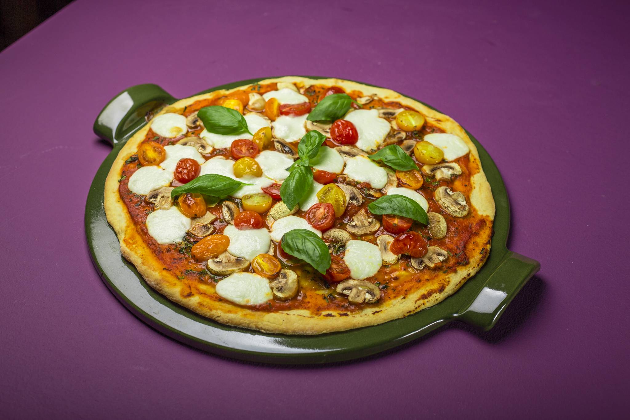 توضع الصينية في الفرن في المنصب الأوسط. تخبز العجينة لـ5-7 دقائق أو حتى يصبح لوجه العجينة قشرة. تخرج العجينة من الفرن وتوضع الصلصة والحشوة على الوجه. ترجع إلى الفرن وتخبز حتى تذوب الجبنة وتصبح الحواف بنية اللون.