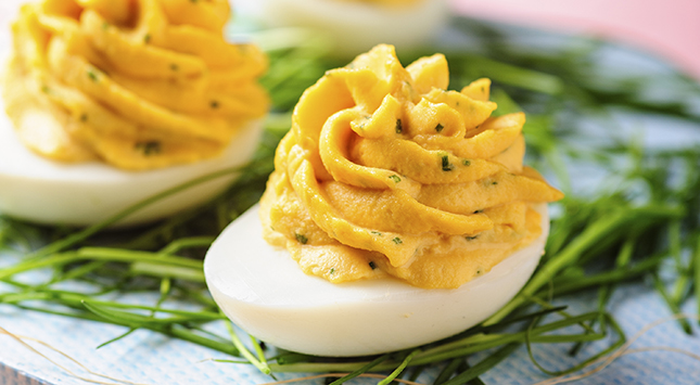 يُغرف أو يُضخ خليط صفار البيض بالتساوي داخل أنصاف البياض، ثم يُغطى البيض ويُبرد في الثلاجة لمدة ساعة كاملة على الأقل أو حتى يصبح جاهزًا للتقديم. يُزين حسب الرغبة.