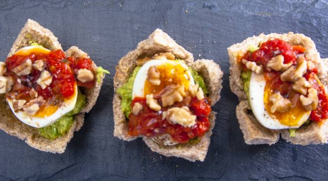 توضع شرائح الخبز على طبق التقديم وتملأ بالأفوكادو.