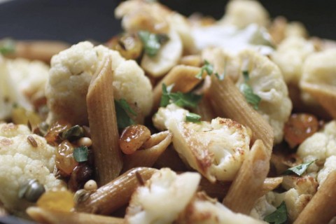 5. ثم فى إناء على النار نضيف المكرونة المسلوقة و نصف كوب من ماء السلق ونضيف خليط القرنبيط والمشروم ونقلب.
