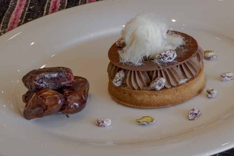 5. طريقة التقديم: في طبق التقديم، يوضع التارت ويغطّى بطبقة من خليط الفستق وموس الشوكولا. توضع آخر طبقة وهي كريما التمر. يزيّن الطبق بغزل البنات (حسب الرغبة).