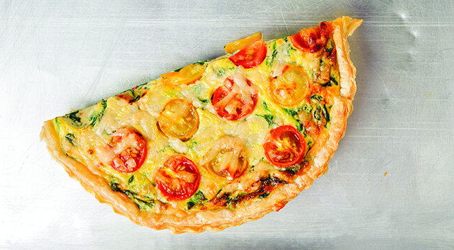 يُصب الحشو في قاعدة عجين البف بستري، وتُرص الطماطم الكرزية في الحشو، ثم يُرش بجبن البارميزان. تُخبز التارت في الفرن على درجة حرارة 180 مئوية لمدة 30 دقيقة أو حتى تتماسك وتصبح ذهبية اللون.