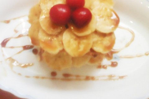 - نضع القطايف ونبدأ نرص طبقات من القطايف والكريمة وقطع الموز المقطعه شرائح وتكرر العملية وتزين بالكراميل والكريز.وتقدم.