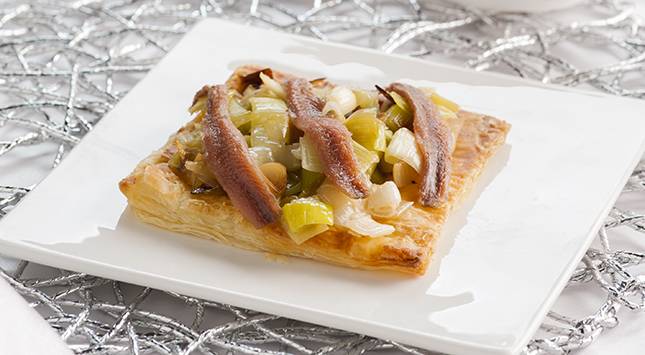 يُغرف الكراث فوق العجين، ثم تُرص الأنشوجة فوق الكراث.