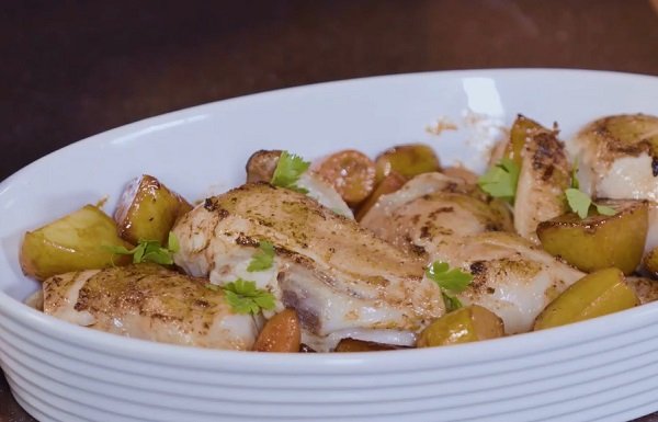 - نضع الدجاج في طبق التقديم مع الخضار ونصب التتبيلة فوقها ونقدم .