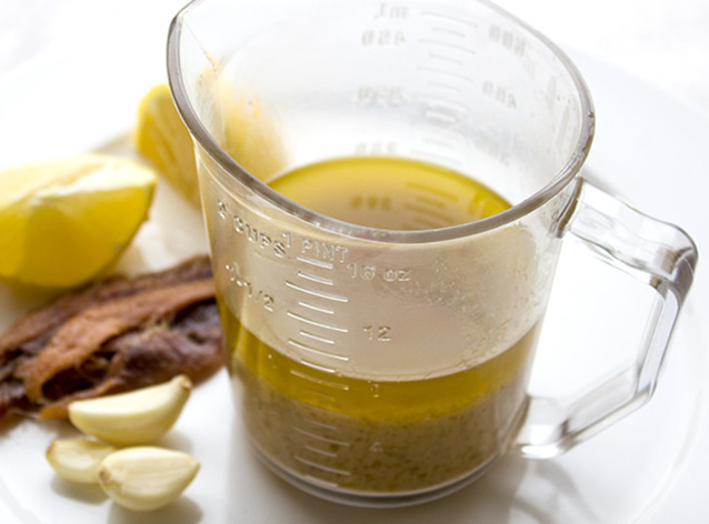 1. يُخلط، في وعاء، عصير وبشر (ناعم للغاية) حبتين من الليمون الحامض، مع 100 ميلليليتر من زيت بذور اللفت.