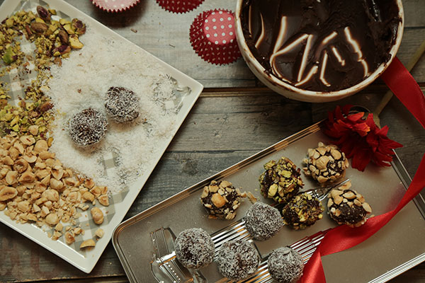 2. يترك الوعاء في الثلاجة لمدة ساعتين ثم تُشكل على هيئة كرات وتُغطى في المكسرات أو الكاكاو أو جوز الهند.