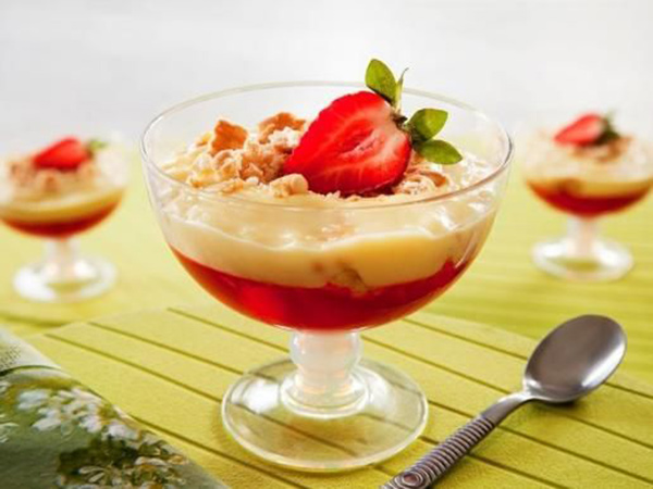 7. ضعي الكؤوس في البراد لساعات عدّة، وزيّني بالبسكويت والفراولة، وقدّميها.
