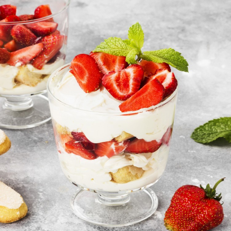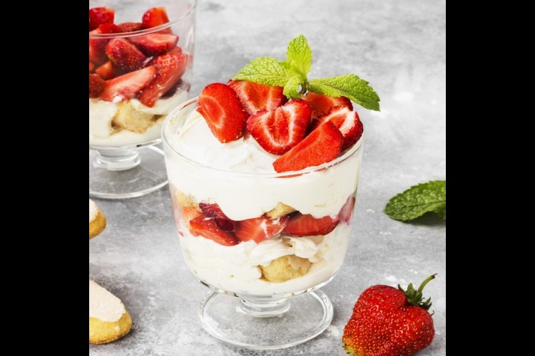 5. اصنعي طبقة من الكيك في طبق التقديم وضعي كمية من الفراولة بالصوص ثم طبقة من خليط الجبن الكريمي والكريمة.