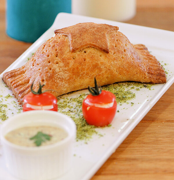 طريقة التقديم: يُقدّم البريوش باللحم ساخناً مع الصلصة ويُزيّن بالطماطم والبقدونس.