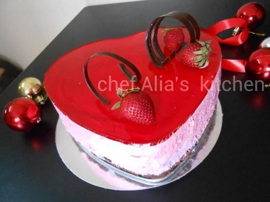 - بعد مرور ال٣ ساعات نقوم بصب الچيلى كطبقة اخيرة ثم نعيد الصينية الى الثلاجة لمدة ٣ ساعات اخرى وبعد ان تتماسك تجمل بالفراولة والشوكولاتة و تقدم .