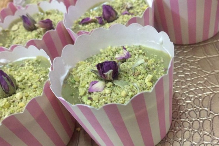 3. نضع فوق البسكويت زبدة الفستق الحلبي وتزين بالفستق المطحون والورد.