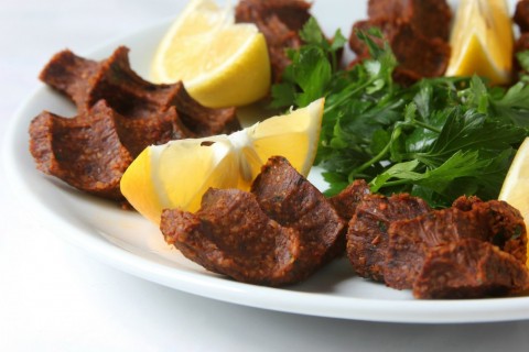 3. ثم نقوم بطحنها مرة أخرى مع اللحم المفروم لمرتين على الأقل بأكثر درجة ناعمة من الطحن. بعدها نقوم بفرد عجينة اللحم في صينية في مكان بارد ونقوم أيضا بفرد بقية المكونات فوقها من ملح، فلفل أسود، مسحوق الفلفل الأحمر الخشن، قطع الليمون، كمون، الثوم والبصل الذي ق