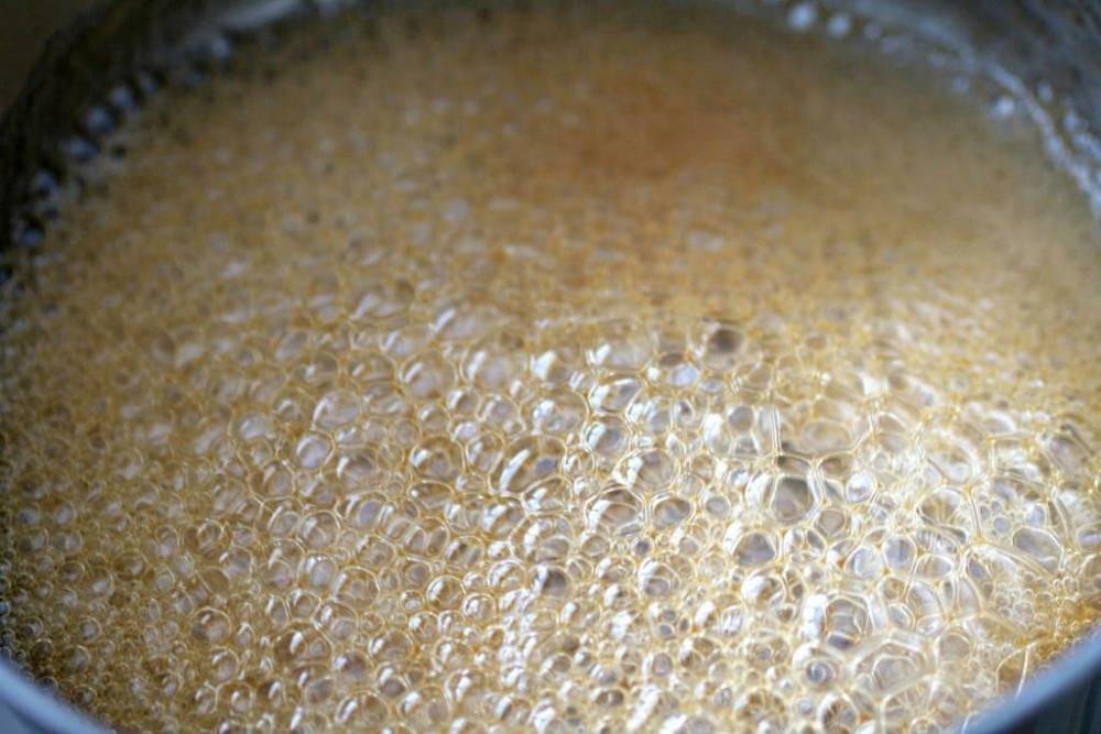 نخفف النار، ونقلبها جيداً حتى تظهر رغوة على سطح الخليط، ونتركه على نار هادئة لمدة 20 دقيقة مع التقليب حتى يثقل القوام، ثم نرفعه من على النار، ونتركه جانبا لدقائق.