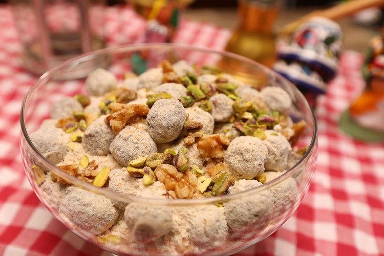 4. ضعي التمرية بطبق التقديم، ثم زيني بالجوز والفستق الحلبي.