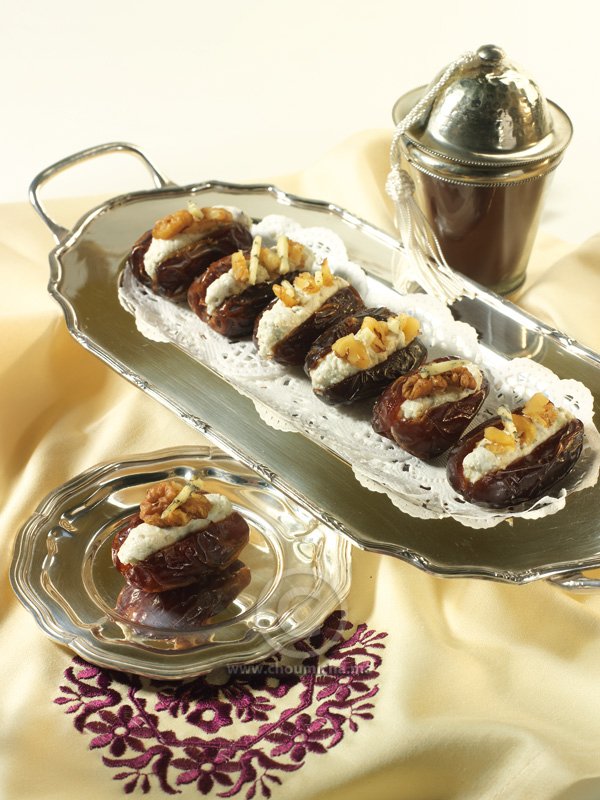 - يقدم التمر مزينا بالكمية المتبقية من الجوز المجروش.