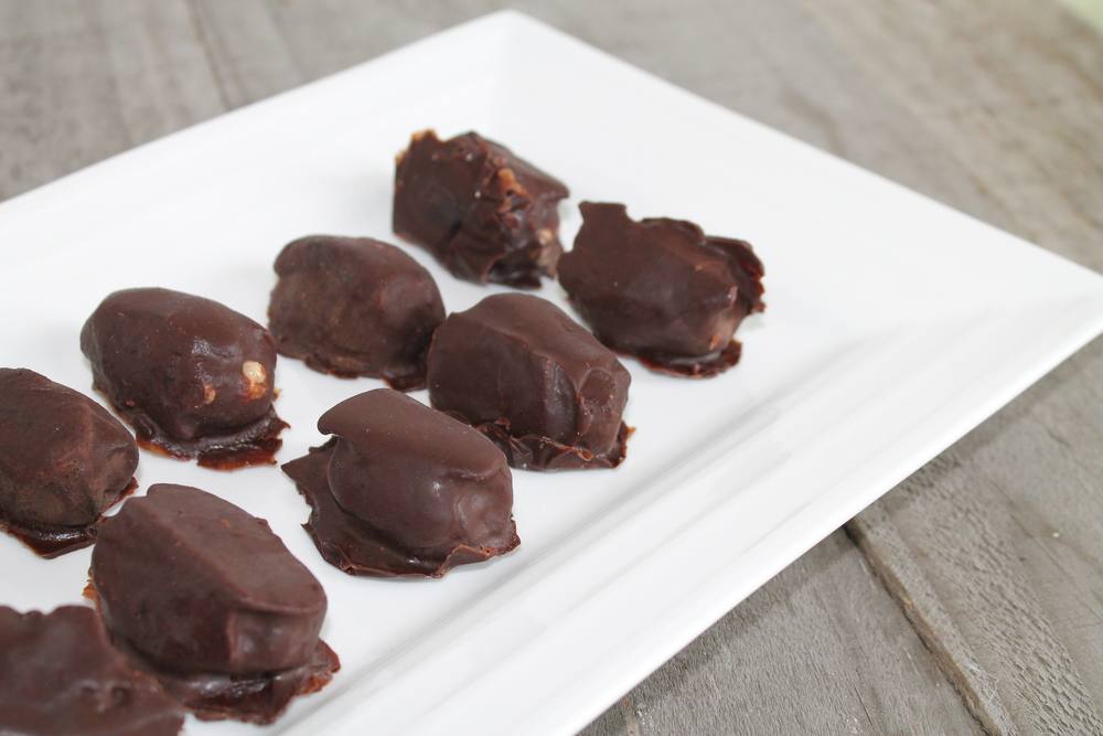 4. تُحشى ثمار البلح باللوز ثم تُغمس في الشوكولاتة الذائبة.