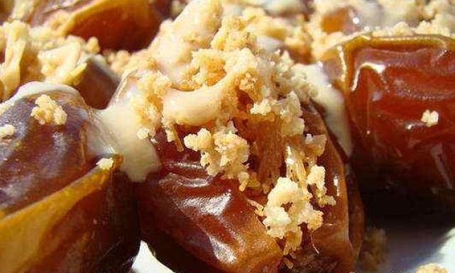 1- ضعي البسكويت والطحينة في وعاء. أخلطيهما حتى تحصلي على عجينة متماسكة. 2- أفرغي التمر من النواة. ضعي في كل حبة من التمر حوالي ملعقة صغيرة من خليط البسكويت. 3- ضعي حبات التمر في صينية فرن. 4- في الخفاق الكهربائي، أخفقي الجبن والحليب المكثّف حتى يتجانس المزيج. أضيفيه إلى حبات التمر. 5- حمّي الفرن على حرارة 180 درجة مئوية. أدخلي الصينية إلى الفرن حتى تنضج المكونات. 6- أخرجي الصينية من الفرن وقدّمي التمر. الف صحة!