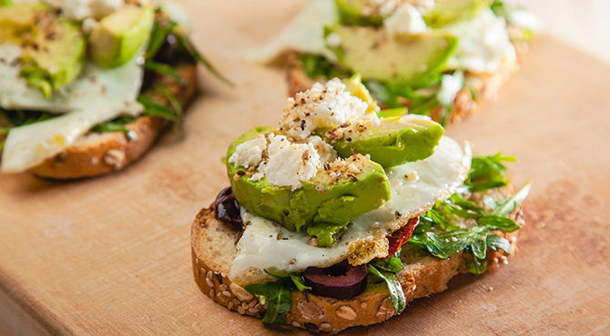 يخرج التوست من الفرن ويوزع فوقه أوراق الجرجير والطماطم المجففة بالشمس والزيتون وشرائح الأفوكادو، ثم يرش بعصير الليمون والدقة.