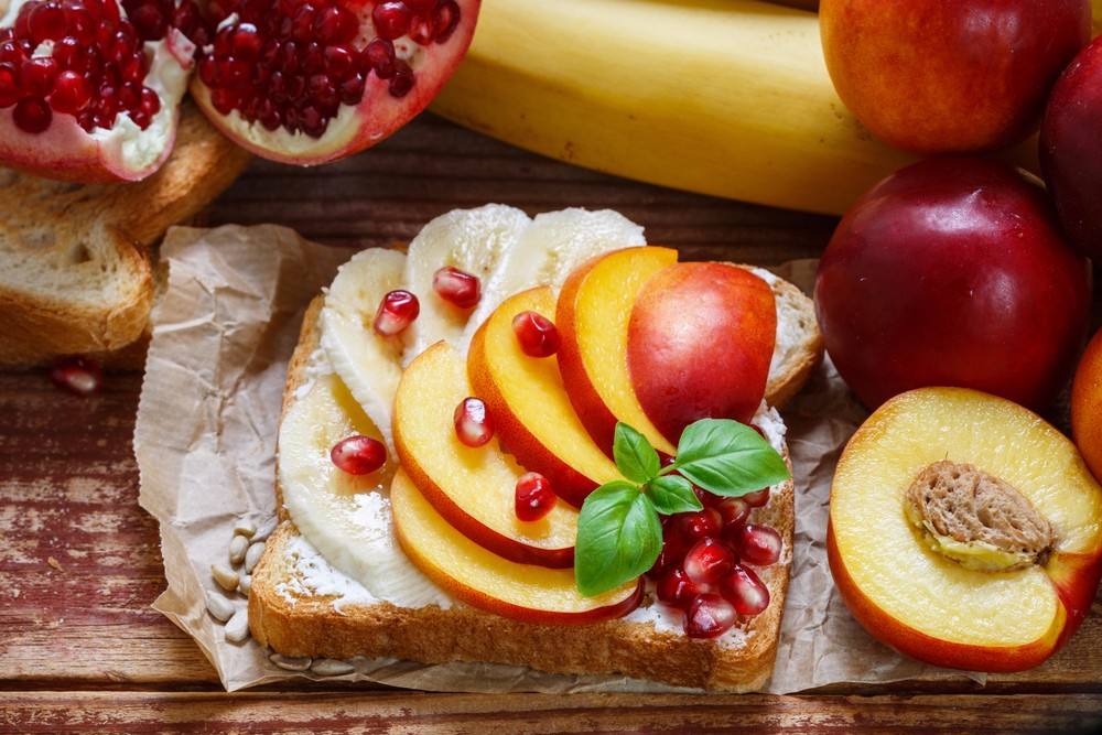 - يدهن التوست بالجبنة، ويرص فوقه شرائح الموز والخوخ.