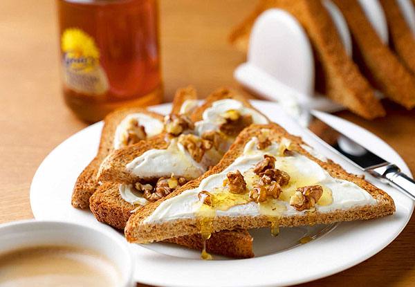 1. نضع على قطعة توست ملعقة جبن ثم يرش الجوز .