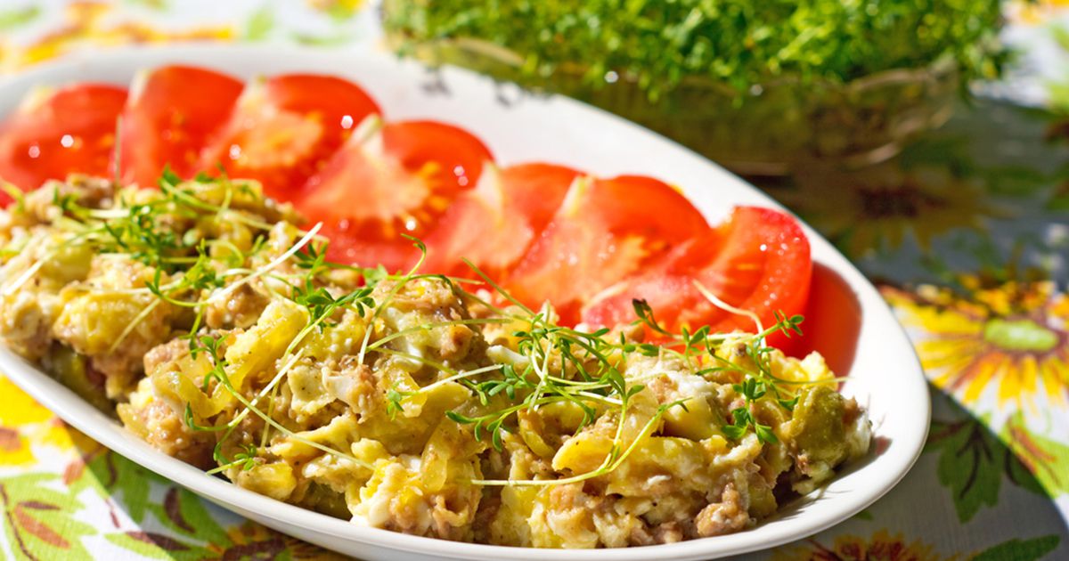 3- أضيفي التونة والبيض. قلّبي المكونات حتى تتداخل. نكّهي بالملح والفلفل الأسود.
