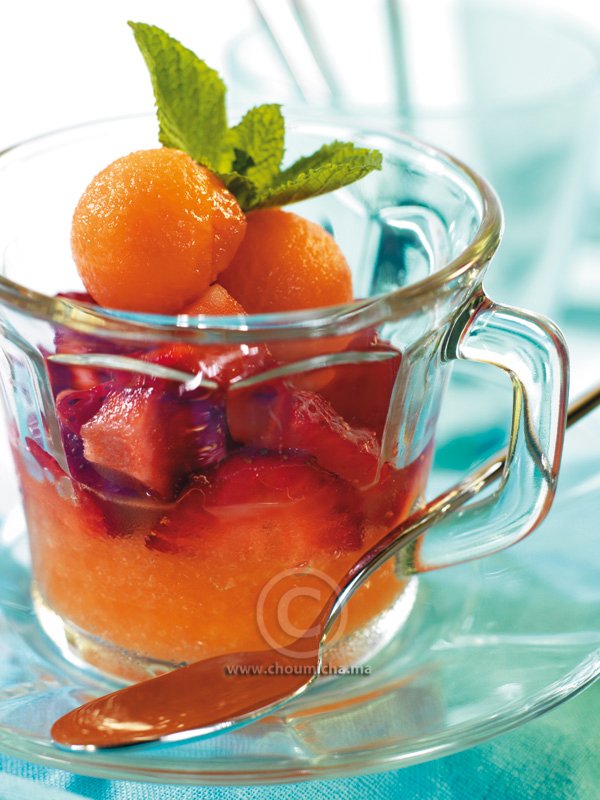 في كؤوس باردة، توضع كرة من مثلجة الشمام ثم تزين بالفراولة وكرات الشمام.