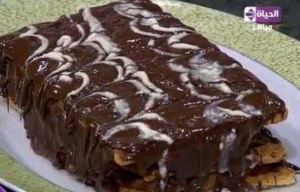 - ضعي خليط الشوكولا الدارك فوق الملفي وغطيها تماما به ثم حددي بعض الخطوط بالشوكولا البيضاء وادخليها الثلاجة قليلا ثم تقدم