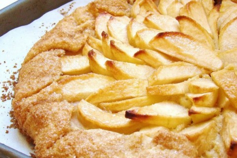 5. نقوم بفرد العجين بين ورقتي خبز ونضعها على صينية فرن مستطيلة ونرص فوقها التفاح بشكل دائري في منتصف العجين مع ترك مسافة 2 سم من طرف العجين.