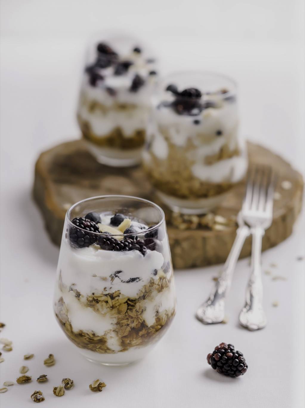 تخفق الزبادى مع السكر ثم ترص الجرانولا فى اكواب التقدم و يضاف اليها الزبادى مع الفاكهه