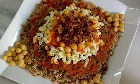 لتقديم الكشرى المصري، اولا نضع ملعقتين ارز وعليهم المكرونة ثم العدس ونرش البصل المحمر من الجوانب والحمص واخيرا الصلصة والدقة وبالهنا والشفا.
