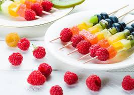 احضري العيدان الخشبية وسيّخي قطع الفواكه بالتبادل ثم ضعيها في طبق التقديم.