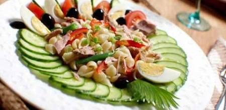 ٢. تصفى التونا من الماء او الزيت ثم تضاف وتخلط بحذر، تترك السلطة 1/2 ساعة ثم تقدم.