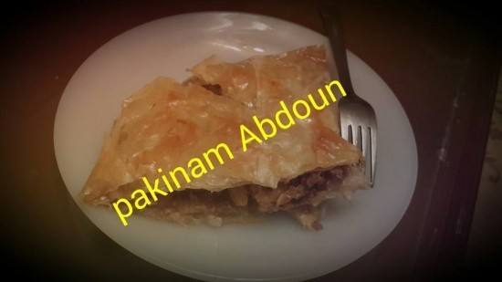 - فى صينية مدهونة زبدة نبدأ نضع الجلاش، نضع الجلاش كله بزاوية عكس بعض وبين كل طبقة ندهن سمنة او زبدة ونضع الحشو فى المنتصف ونغلقه مثل الظرف و ندهن زبدة او سمنة بين كل طبقة .