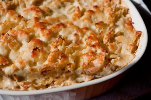 - يتم تغطية الصينية البايركس التي بها الجمبري بالبشاميل جيدا مع رش طبقة من الجبنة الموزاريلا علي الوش.