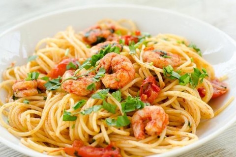 3. نضيف الثوم المهروس وقليل من الزيت على المكرونة ثم نضيف الجمبري ونرش البقدونس للتزيين.