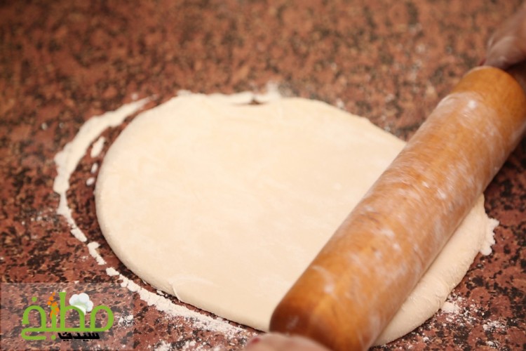 لعمل العجين: نخلط الطحين والملح والماء مع بعضهما جيداً حتى تتشكل لديك عجينة متجانسة، ثم تترك العجينة لترتاح قليلاً، ثم نبدأ بفردها باستخدام المرق (الشوبك) مع رش القليل من الطحين بعد فرد العجين