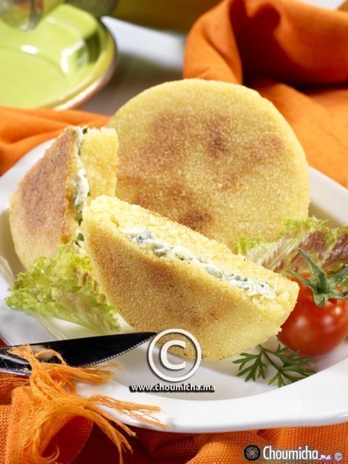 - فوق طاولة عمل مرشوشة بالسميد، تشكل خبيزة من العجين، تحشى بخليط الجبن ثم تطوى حواف الخبيزة حول الحشوة. تبسط الخبيزة قليلا وبرفق لإعطائها شكلا دائريا.