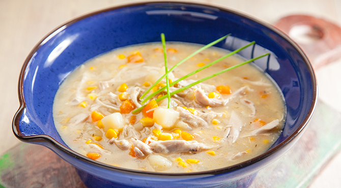يضاف الثوم والجزر والبطاطا وحبات الذرة وتقلب حتى تمتزج جيداً ويترك على النار مدة 8-10 دقائق.
