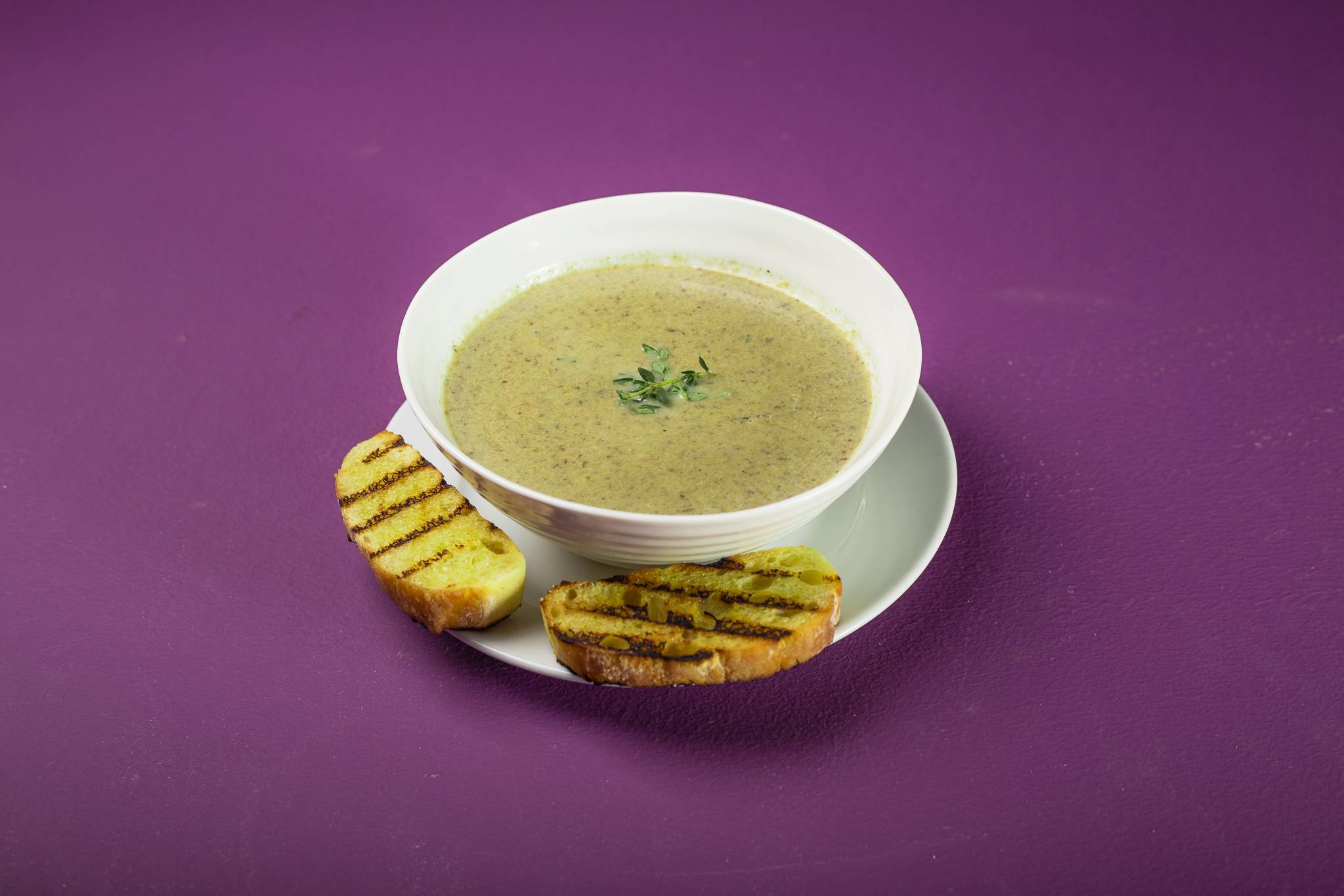 يصب الحساء في زبادي، يزين بالبقدونس المفروم وبقية الفطر، ويقدم مع الشياباتا جانباً.